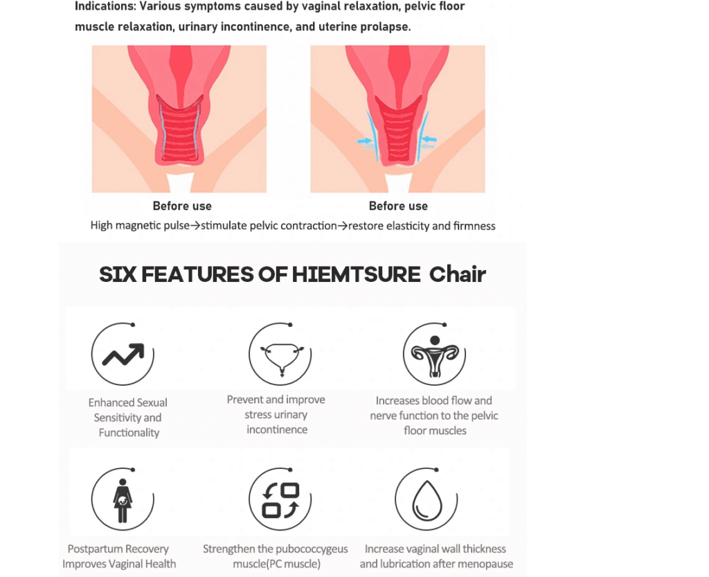 4.The Kegel chair is most suitable for patients with mild to moderate pelvic floods function, and for severe patients who do not want surgery. But how does it work? The chair uses electromagnetic stimulation to strengthen pelvic muscles without any pain or effort. By sitting fully clothed in the chair, focused energy penetrates deep into the pelvic floor, triggering thousands of muscle contractions in a single session. These repeated contractions help train and tone the muscles, improving bladder control and core stability.