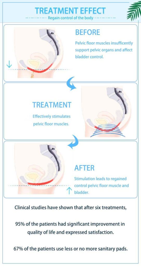 5. Urinary incontinence that comes from three different ways. Stress, urge incontinence and mixed incontinence. Stress urinary incontinence leaking urine during coughing sneezing or physical activity. Urge incontinence: Uncontrollable urine leakage when suddenly needing to urinate . Mixed incontinence: Combination of stress and urge incontinence symptoms It is a comfortable option for men and women of any age who desire a noninvasive solution for urinary incontinence. Due to factors such as the body`s normal aging, childbirth, menopause or obesity, the pelvic floor muscles weaken and insufficiently support the pelvic organs. The factors directly correlate with urinary incontinence.
